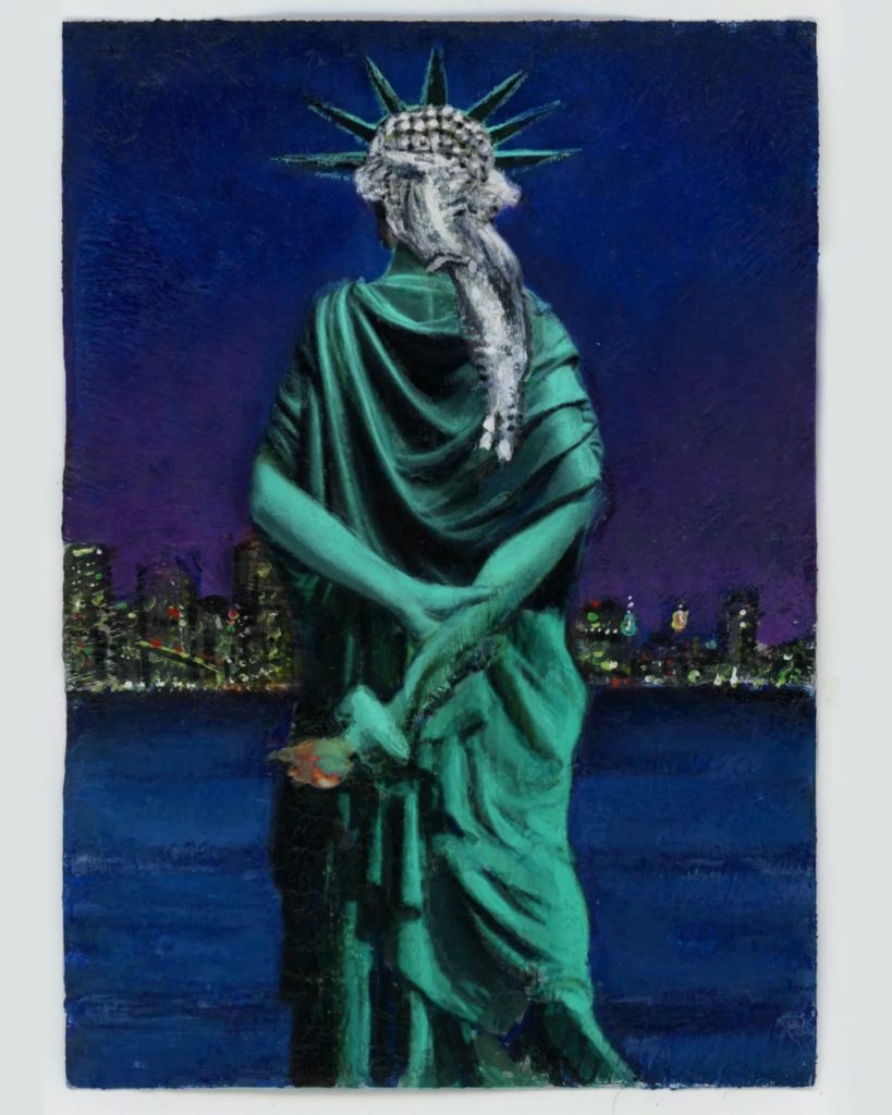 ریدیککولوز، یک هنرمند اردنی-آمریکایی که در نیویورک زندگی و کار میکند، نقاشی خود از مجسمه آزادی در سال ۲۰۲۳ را با الهام از حنظله، کارتونیست سیاسی فلسطینی ناجی العلی، از یک پناهنده ۱۰ ساله که پشتش به بیننده است، طراحی کرده است. العلی در همان سنی بود که مجبور به ترک فلسطین شد و تصریح کرد که حنظله در زمان منجمد شده است و تنها زمانی که فلسطینیها بتوانند به سرزمین مادری خود بازگردند، رو به جهان خواهد کرد.