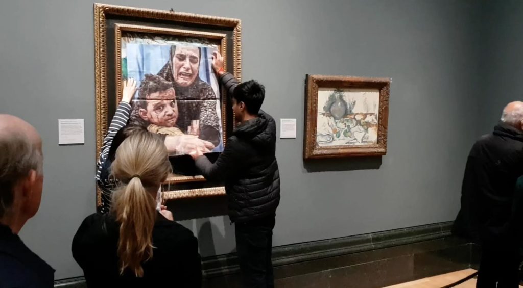 دو روز پس از سالگرد حمله ۷ اکتبر حماس و آغاز حملات اسرائیل به غزه، گروه فعال بریتانیایی «تقاضای جوانان» با تغییر موقت ظاهر یکی از نقاشیهای پابلو پیکاسو در گالری ملی لندن، تظاهراتی در حمایت از فلسطین برگزار کرد. جای هالای و دوشنبه-مالاچی روزنفلد، فعالان، برچسب بزرگی از یک زن فلسطینی گریان و پسر خردسالش را که صورتش غرق در خون بود – عکسی که توسط علی جادالله، روزنامهنگار ساکن غزه، پس از حملات هوایی اسرائیل به بیمارستان الشفا گرفته شده بود – به شیشه محافظ تابلوی «مادری (La Maternité)» (۱۹۰۱) پیکاسو چسباندند.